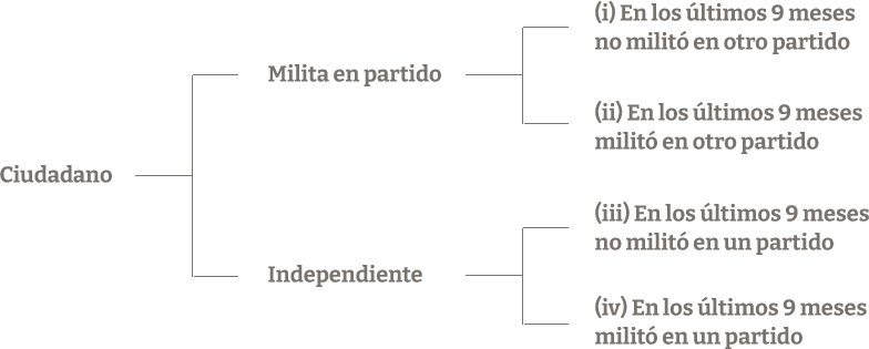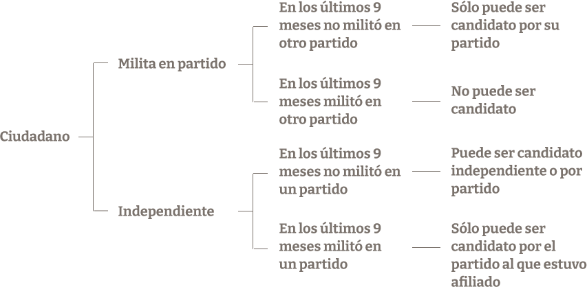 Los ciudadanos de la categoría (i) solo pueden ser candidatos del partido político al que pertenecen. Los ciudadanos de la categoría (ii) no pueden ser candidatos de partidos políticos (ley 18.700, art. 5 inc. 4). Tampoco pueden ser candidatos independientes (id. inc. 6). En consecuencia, aun cuando no tengan prohibición expresa de ser candidatos, estos ciudadanos no pueden serlo como consecuencia de las reglas establecidas para evitar los cambios de militancia política con fines exclusivamente electorales. Los ciudadanos de la categoría (iii) pueden ser candidatos de partidos políticos o independientes. Por último, los candidatos de la categoría (iv) pueden ser candidatos del partido político al que estuvieron afiliados.