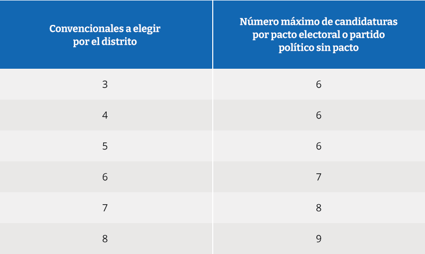 Dos o más partidos políticos pueden conformar un pacto electoral (ley 18.700, art. 4 inc. 1). Los pactos electorales son nacionales. Cada pacto electoral o partido político que no integre un pacto electoral puede presentar para cada distrito un número variable de candidatos, que pasan a conformar una «lista». El máximo de candidatos que puede integrar una lista está determinado por el número de convencionales constituyentes que elige el distrito respectivo. Este último número fluctúa entre tres y ocho. Por regla general, el máximo de candidatos a presentar es igual al número de cargos a elegir más uno (ley 18.700, art. 5 inc. 1). La disposición 30ª transitoria de la Constitución Política modifica sin embargo esta regla general, de manera que el máximo de candidatos a presentar es el que se indica en la siguiente tabla: