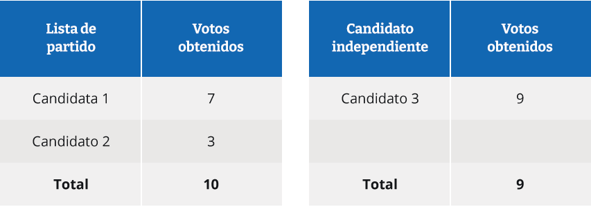 Si en este caso hubiera un solo cargo a repartir, este correspondería a la candidata 1, quien obtuvo 7 votos. La razón de ello es que el cargo corresponde a la lista que más votos tuvo, de manera que la candidata 1 se ve favorecida por los votos que obtuvo su compañero de lista (el asunto es más complejo cuando hay más cargos a repartir, pero la totalidad de votos obtenidos por la lista es siempre el primer criterio de distribución de cargos). El candidato independiente, en cambio, no goza de esa posibilidad.