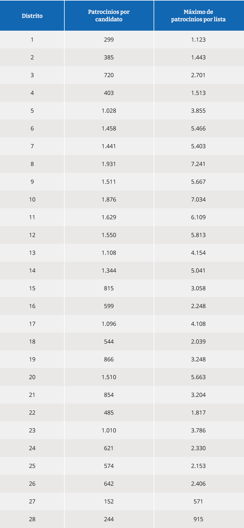 Para cada distrito, el número de patrocinios requerido es el siguiente: