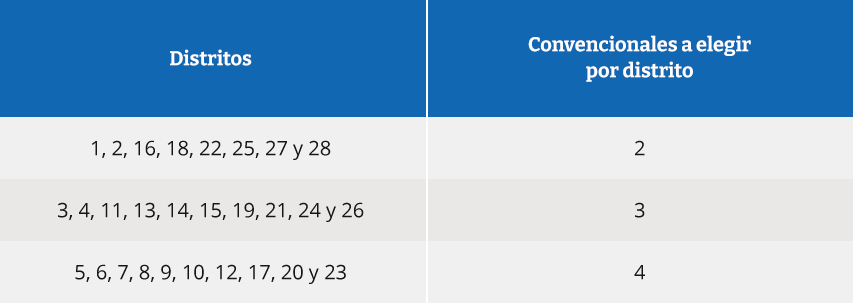Si bien se utilizan los mismos distritos que para las elecciones de diputados (CPol, art. 140, en relación con el artículo 188 de la ley 18.700), el número de convencionales a elegir por cada distritito se reduce, a objeto de sumar 86 en vez de 155. De este modo, cada distrito elige el número de convencionales que a continuación se indica: